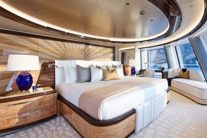 The Owner’s suite in particular is furnished with a wool carpet and enjoys sweeping forward views through floor-to-ceiling windows, and oversized armchairs accompany the daybed and desk to create a functional private space elsewhere, the en-suite bathroom has crocodile skin-style frosting patterns on the large showers and directly outside is an alfresco lounge where guests can wake up to coffee in the fresh air. The Owner also has access to a library/office space where silver leather is pressed with tobacco leaves and birdseye maplewood surround those seated at the desk.