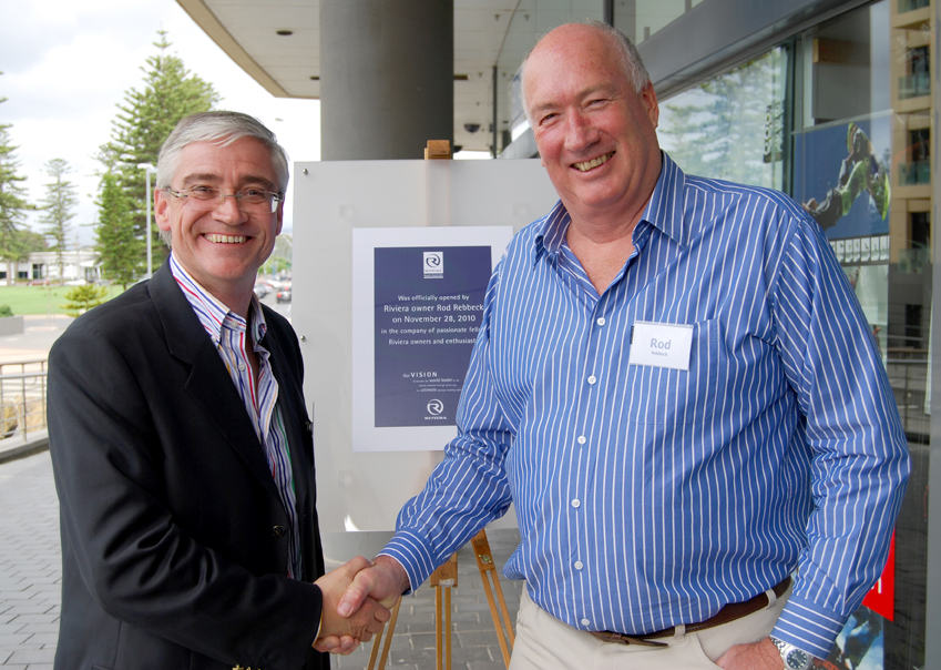 Please contact CharterWorld - the luxury yacht charter specialist - for more on superyacht news item "Riviera's Director of Brand and Communications Stephen Milne congratulates Riviera owner Rod Rebbeck who officially opened the new dealership".