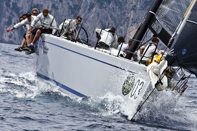 In the Mini-Maxi Class, Andres Soriano’s Mills 68 Alegre has a perfect score so far but there is no discard at Rolex Capri Sailing Week which is probably why the opted for a conservative start for the first race of the day. All of the Mini-Maxi fleet opted to head for the mainland shore, to gain a lift from the breeze accelerating across the land, and despite their late start, Alegre powered through to make the top mark by some distance. Peter Ogden’s Reichel Pugh 60 Jethou was sporting a new revolutionary sail material 3Di and after reaching at speed to the offset mark. Jethou hoisted their spinnaker and sped off at 18 knots. They were surfing faster than the wind, the asymmetric sail producing apparent wind like a turbo charger.