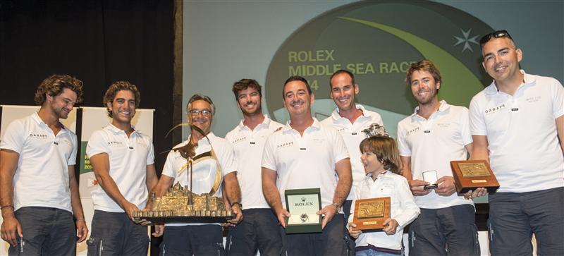 Lee Satariano and crew of ARTIE (MLT) receiving the Rolex Middle Sea Race trophy and Rolex timepiece – Photo by Rolex Kurt Arrigo