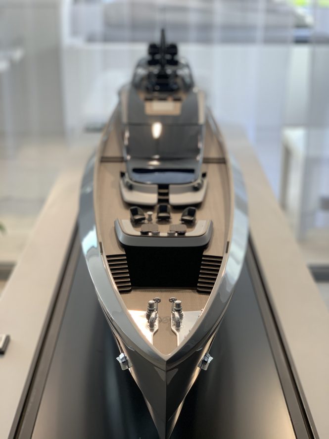 The luxury yacht concept takes inspiration from the first collaboration between the shipyard and the design studio in 2017, motor yacht AUREA. She is a sleek and sporty 65.5m/214.9ft that combines modern masculine lines with the latest technology for wide open social areas providing life’s luxuries. The main deck aft, foredeck and sundeck all have a generous spa pool in addition to a whole selection of sun-exposed and shaded alfresco dining and living areas. Subtle characteristic touches can be found throughout, such as the staircase design that was inspired by the air intakes on sports cars and joins seamlessly with the floor-to-ceiling windows.