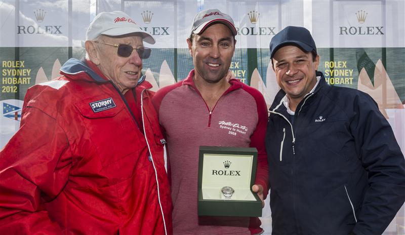 Line honours presentation – (L to R) Bob Oatley (sailing yacht Wild Oats XI owner), Mark Richards (Wild Oats XI skipper) and Patrick Boutellier (Rolex Australia) – Photo Rolex – Carlo Borlenghi