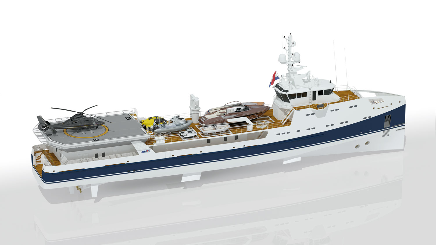 This image is featured as part of the article Sale of First 69m SEA AXE 6911 Yacht Support Vessel with Heli Hangar.