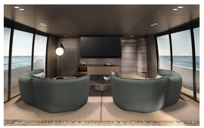 Interior styling comes from Laura Sessa, with colours chosen to reflect the Mediterranean cruising grounds. The VIP stateroom and two guest cabins are placed on the lower deck, while the upper deck hosts the Master suite.