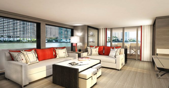 Architect and designer Patricia Urquiola was responsible for styling the interiors, which use a modular design to evolve and adapt with the needs of the Owners as well as the guests. A modern and pale colour scheme was chosen to enhance the sense of volume while sunlight streams in through the broad windows across the decks, and a nautical theme can be found in the cool grey and blue colour scheme. One way films were applied to the windows on the lower deck, allowing for greater privacy while docked at marinas without compromising on views or natural light.