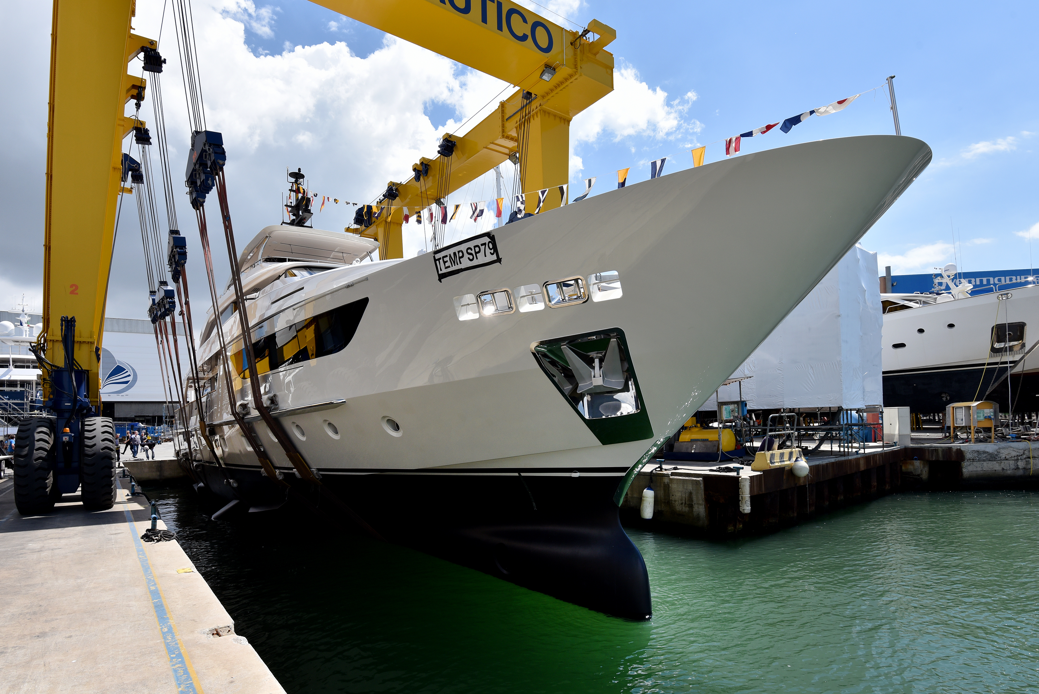 Motor yacht SIM SIM, the 14th SD1226 hull, being launched at Sanlorenzo’s Viareggio shipyard