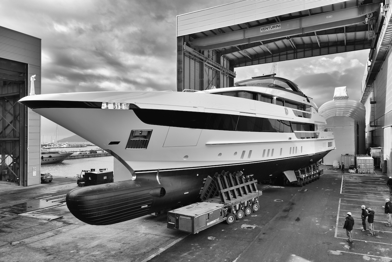 Superyacht Sanlorenzo 52Steel hull 2 exiting shed for the first time – Credit Sanlorenzo