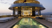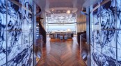 Abstract art is a prominent feature in the design, from the mosaic in the 9m/30ft swimming pool to the ink-like swirls playing on the video screens on either side of the connecting catwalk between salons. The looped video artwork was used in Gherardi’s retail spaces for Christian Dior.