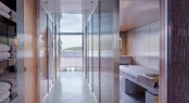 The guest accommodation uses curved hallways and winding staircases to create a sense of natural fluidity. By taking visual queues from the surroundings and following the red hallway guests will find themselves in the entrance to the Master suite, where a study leads through to the forward-facing bedroom. Similar to the design of the communal spaces, the curving windows provide all-encompassing views and integrated doors open up onto the deck.
