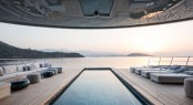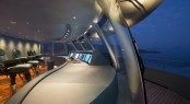 The sliding doors hidden within these black bands open up each of the communal spaces – even the gym on the skydeck has the same ability to let guests move out beyond its four walls. The effect is a blurring between indoor and outdoor spaces and nowhere is this more pronounced than with the main salon. “We have used mostly sliding doors, which are hidden,” Gherardi says. “Another factor that lends connectivity are the skylights, the opening in between decks and the mirrored ceilings that reflect the sea and increase the overall volume.”