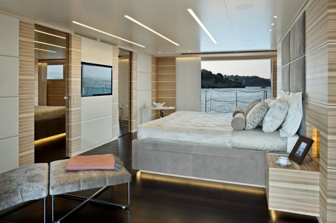 The interior décor is contemporary and exceptionally inviting, with a lovely mix of neutral and soothing toned soft furnishings, warm woods and pale panelling. The main salon offers a relaxed ambiance with ample seating, coffee tables and starboard side opening balcony. An upper lounge features the formal dining table and additional seating, ideal for entertaining and socializing.