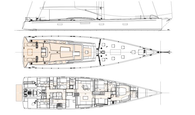 At 31.41m/96ft, she will be able to accommodate six guests across three cabins: master suite, a twin, and a double cabin. The crew quarters will include a captain’s cabin and a Pullman bunk crew cabin starboard.
