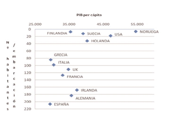 The statistics indicate the potential for growth of the marine industry in Spain. It is also clear that those countries with similar GDP per capita to the Spain (France, UK, Italy, Greece) have a much higher level of nautical development (residents with recreational craft).