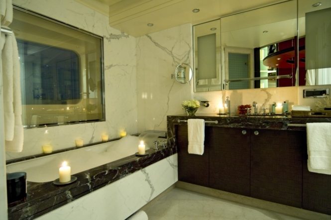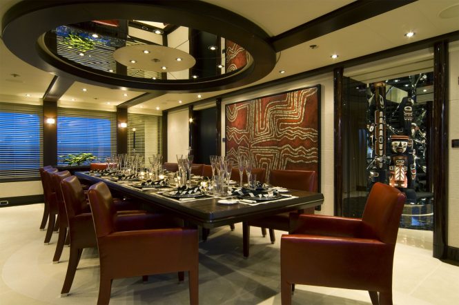 The main salon contains a full-beam Master suite fitted with a private forward observation lounge, an office, and separate bathrooms. Guests entering the open-plan main salon via the foyer will first encounter the elegant formal dining area designed to seat up to eight guests in an art-filled interior further enhanced by floor-to-ceiling windows for impressive views and plenty of natural light.