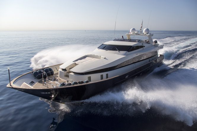 The yacht is powered by twin Deutz V 12 engines, providing cruising speeds of 26 knots and top speeds of 28 knots. Zero speed stabilizers are fitted for additional stability while cruising and at anchor.