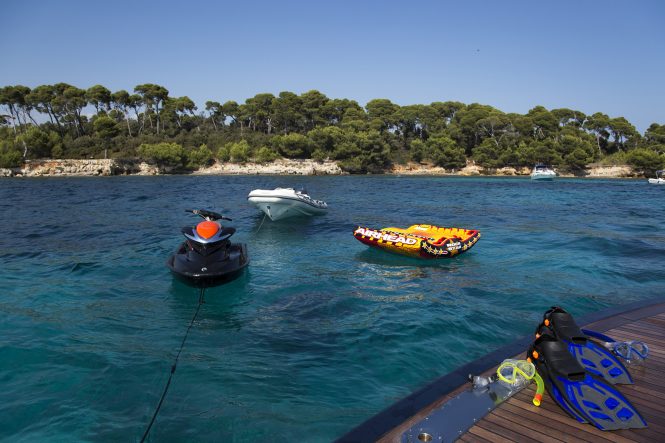 On deck, the Costruzioni Navali Tigullio CAPPUCCINO has vast areas for a relaxed charter experience. On the aft deck adjacent to the salon is an alfresco dining table and built in seating. The foredeck boasts a raised large sunpad. Her upper deck is great for entertaining, offering an alfresco dining option, service station, seating and sunpads. Guests wishing to make the most of the water toys available, will find the extended swim platform ideal for easy and safe sea access.