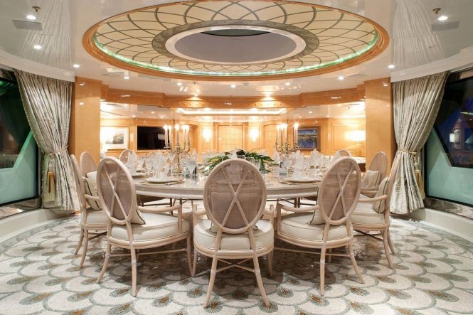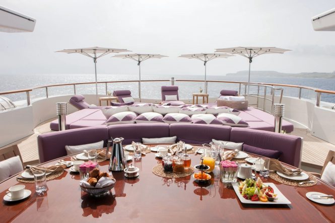 Her interior décor is refined and elegant with neutral furnishings and a sophisticated ambiance. The main salon is laid to an open plan, offering a sumptuous lounge centred, formal dining forward, and full-service wet bar aft, ideal for any entertaining occasion. On the upper deck, there is a further lounge, games table and dining option. In addition to the social areas, the yacht boasts a relaxing spa and main deck master stateroom.