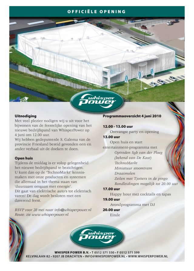 The new, modern 5,500 m² eco-premises of WhisperPower in Drachten (Netherlands) will be opened in spectacular fashion by Member of the Provincial Executive of Friesland, S. Galema on Friday 4 June.