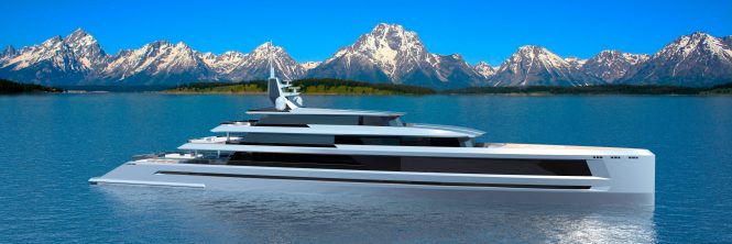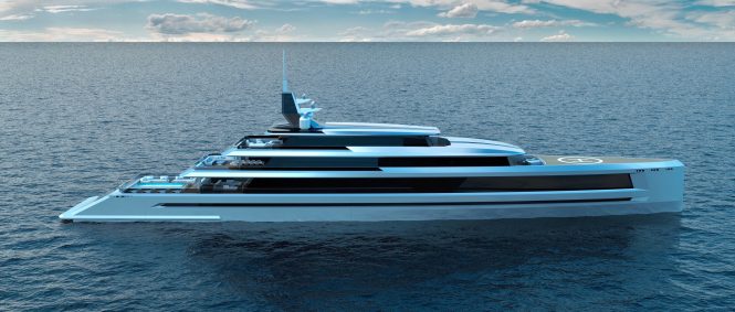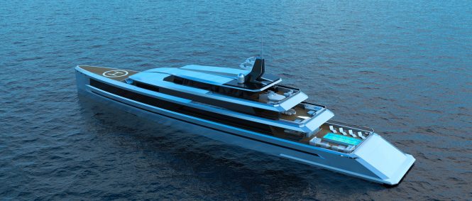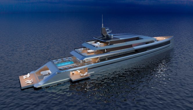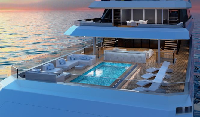 The concept images show a large transom door that folds down to become a deep swim platform, revealing a spacious beach club within the lower deck stern that is fitted with a bar and spa pool. The bulwarks on the port and starboard sides fold down to create side terraces and open up this recreational even more to the scenery.