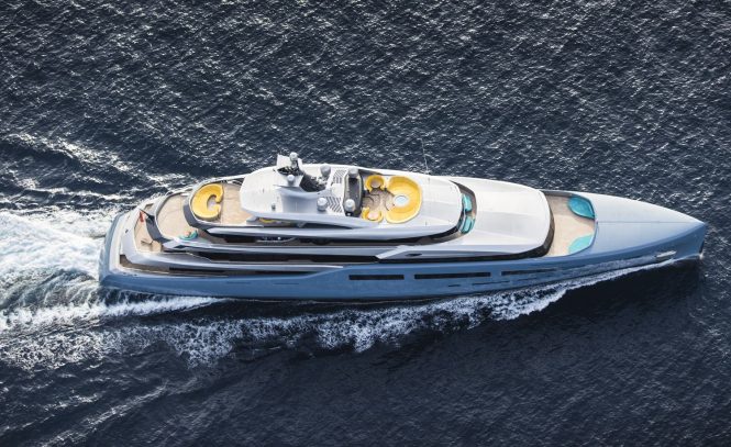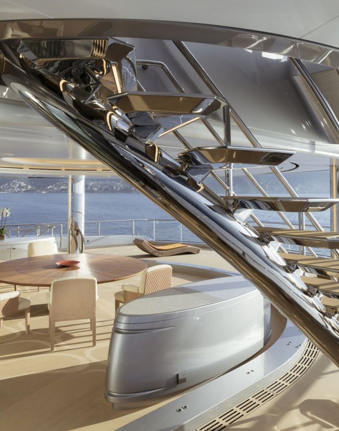 The exterior has a large swim platform and beach club in the stern form a large guest area beside the water, and a number of shaded and sun-exposed aft lounging areas run from the main deck up to the sundeck, which are connected by under-lit glass staircases that enhance the atmosphere on board at night. The sundeck is the centre of outdoor activity and here guests have a choice of circular sunpads or secluded sunbathing spots close to the helm station.