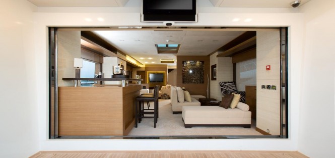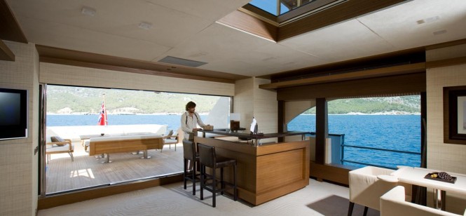 Namaste yacht features flowing interior and exterior living areas with innovative features designed by Julia Tamsen. The view is accentuated by large panoramic windows, retracting ceilings and open deck areas. A wonderful relaxed feeling has been created on board of this vessel. Nearly a metre wider than most yachts of her size, superyacht Namaste has impressive interior volumes, set off by contemporary loose furniture and a natural colour palette.