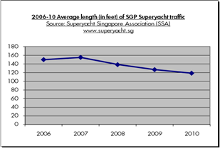 Although the number of superyacht visits has grown by 37%, the overall average foot-run for visiting vessels has seen a drop from 127 feet in 2009 to 119 feet in 2010.