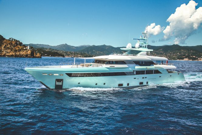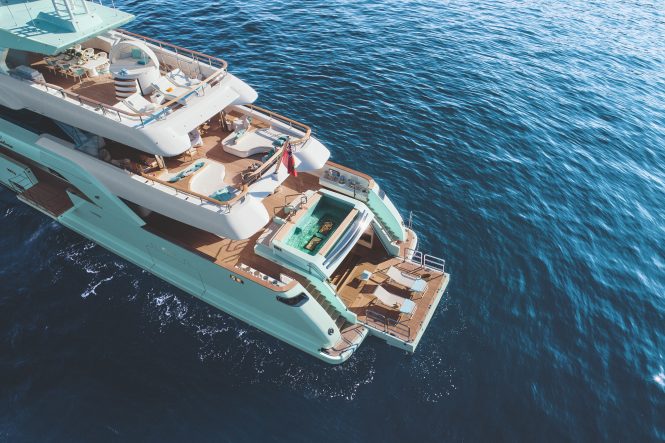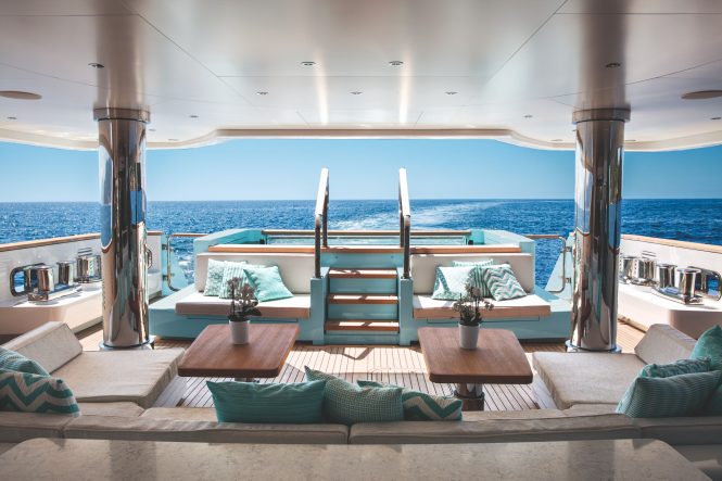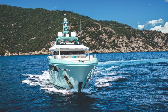 A host of facilities are placed inside and out across four decks as well as an under deck, all of which are concealed behind the classical styling and shapely bow. The bespoke turquoise shade of the hull changes depending on the time of day and further coloured by the colour of the seawater underneath. The teak decking of the beach club and swim platform stands out all the more for the soft colouration in the surroundings and the plush furnishings with rounded edges reminiscent of the 60s and 70s eras.