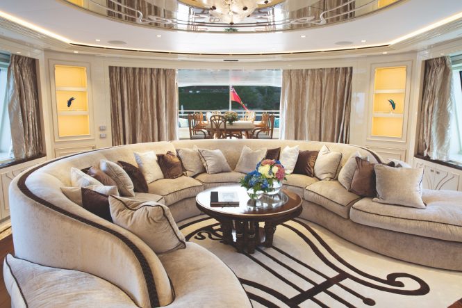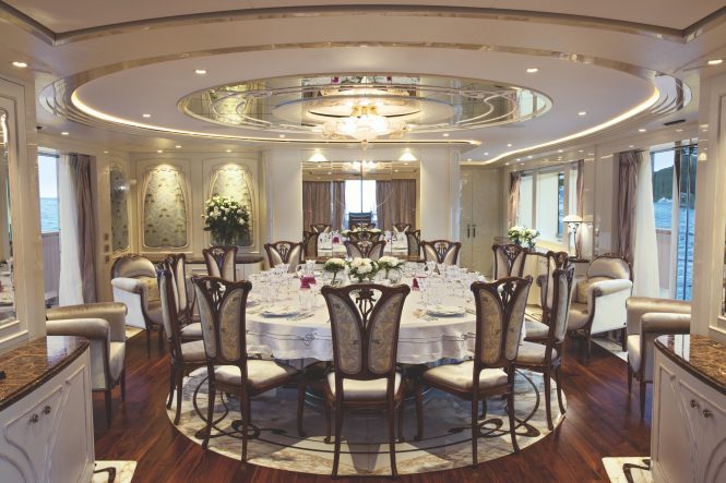 From the main deck aft guests can enter the grandiose formal dining area, which places 12 embroidered chairs around a circular walnut table. The ceiling mirror enhances the delicate light is surrounds, while two floor-to-ceiling glass sliding doors on the port and starboard sides open the room up to the elements and the side terraces. A galley is directly hidden behind the wooden panelling for a seamless appearance that minimises disruption to guest interaction and service.