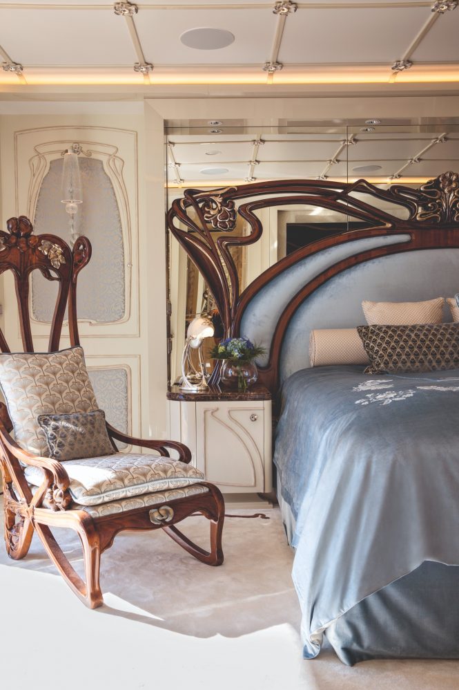 Forward, the full-beam Owner’s apartment is laid out with a private salon featuring a balcony that can be used even while in motion. Walnut is used throughout the interior and nowhere does it look more impressive than on the headboard of the velvety sky blue Master bed. Across the ceiling the lighting is delicately emphasised by bespoke five-petal flowers carved in wood. Carrara and Calcutta marble decorate the his-and-hers bathroom, where a hydro-massage tub takes centre stage along with a walk-through shower.