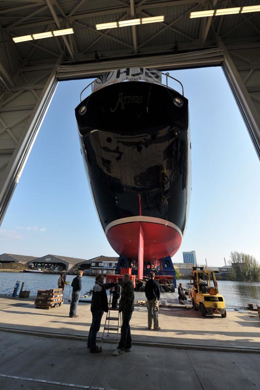 Too heavy to lift with a crane, the wheels of a giant trailer were carefully inserted under the cradle and the entire 400-tonne structure was carefully driven on to a pontoon. The next stage of this major logistical operation saw the barge and its precious cargo towed on a two-day journey from our yard in Zaandam (close to Amsterdam) to the northern Dutch port of Harlingen. It was here that Athos’ deep-V hull made her first contact with the water as the yacht was launched by a massive 2000-tonne lift.