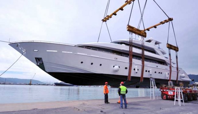 On a sunny, late spring morning Italian yard Custom Line, a member of the Ferretti Yachts Group, launched the first yacht in their 124’ Custom Line yacht model using the travel-lift system at the Ferretti Group facility in Ancona.