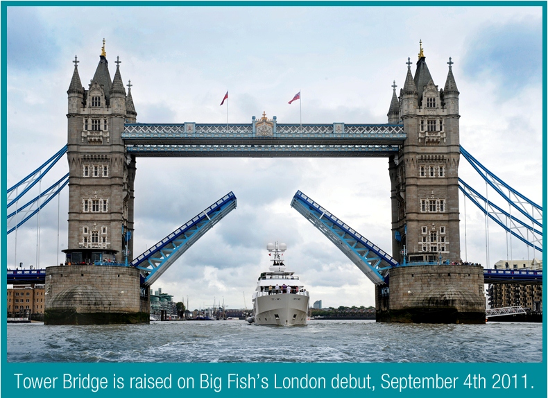 The expedition (explorer) superyacht BIG FISH, the 45m (147′ 7″) yacht designed by Greg Marshall Design and launched by McMullen & Wing New Zealand in 2010 has recently visited London en route to the Monaco Yacht Show 2011. Motor Yacht BIG FISH is seen here cruising the Thames River, passing under the raised Tower Bridge.... ... read full story