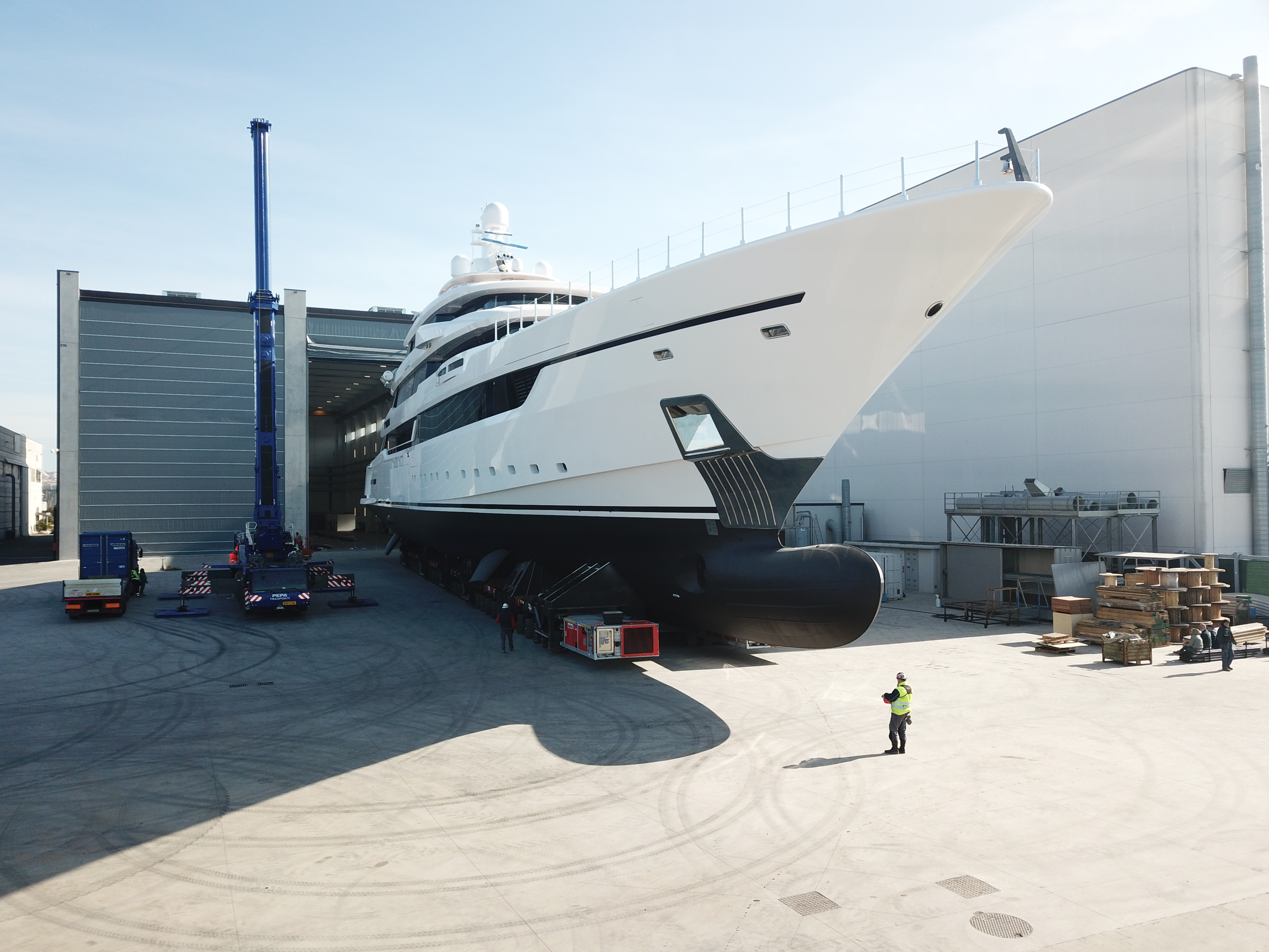 80m Columbus Classic luxury superyacht DRAGON leaves shed at Palumbo Superyachts