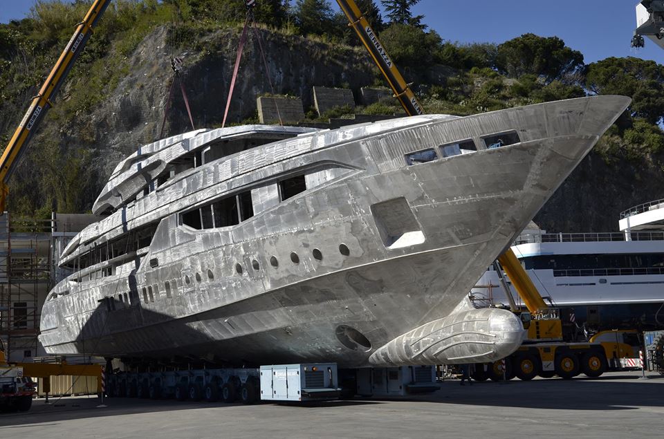 Photos of the 50-metre Mondomarine super yacht M50 (Hull 22-04), currently in build in Savona, Italy. The vessel's hull and superstructure were joined together yesterday, on April 7, 2015. ... read full story
