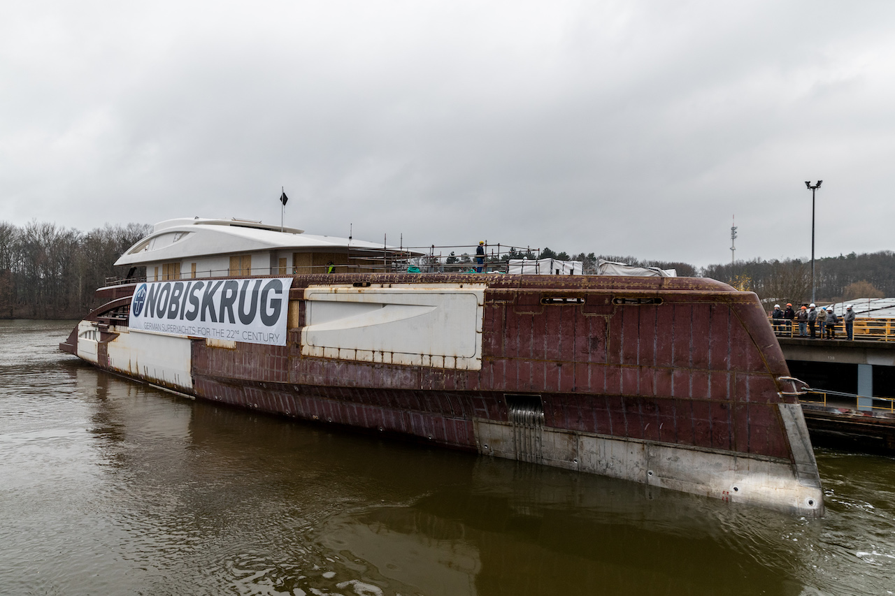Nobiskrug moves 77-metre hull of Project Black Shark to Rendsburg facility