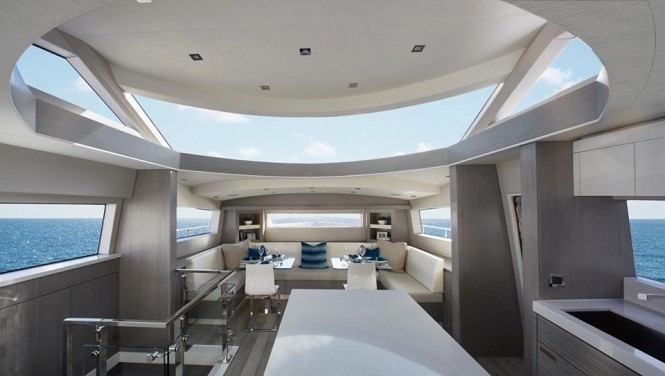 Hatteras 70 – Flybridge dining area sheltered by the hardtop