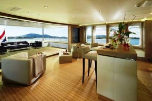 This tri deck yacht’s spacious exterior decks can be seen in the photos below. She has a huge spa pool on the centerline of the sun deck and vast deck space to thte aft of the sundeck as well as comfortable seating in the shade and a bar. She comes with lots of toys, including a 23ft Chris-Craft runabout, a 16ft Nautica inflatable, a 15 ft sailboat, two personal watercraft, two SeaBobs and much more.