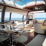 The new Azimut 120 SL has sleek lines with curved windows creating a dramatic exterior profile that will surely turn heads. Glass doors lead from the aft deck area into the main salon which is flooded with natural light from oversized windows, glass doors and glass panels above. Geometric shapes run throughout the new Azimut 120 SL’s light and contemporary interior. There are generous seating areas on deck and a dining area on the aft deck. Up forward there is a seating area and sunbathing pads provide uninterrupted views ahead.