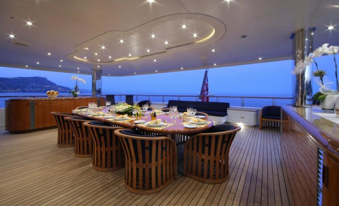 One of the finest superyachts to charter in the East Med is Sovereign. She was launched in 2011 by Newcastle Marine, the US builder. With expansive living space, she has six well-appointed state rooms on board. These include two master state rooms. The upper master has magnificent views with the main deck master providing panoramic views through eight very large oval windows. On the main deck, there’s a dining area and large saloon. The upper deck has a sky lounge while the sun deck has lots of seating and lounging spaces. A wet bar and infinity pool/Jacuzzi give guests the opportunity to have an exotic drink, swim or just relax. There’s an aft tender garage or beach club, Zero Speed stabilisers, elevator with wheelchair access as well as the latest communication and navigation electronic equipment. Expect very high levels of comfort no matter what the sea conditions are when sailing on Sovereign. She also has accommodation for up to 14 crew members in seven state rooms. The crew are there to ensure each guest has everything he or she needs while on board this beautiful vessel. Dining al fresco, expect amazing Greek food, then afterwards, head to the cocktail bar for a glass of ouzo or champagne.