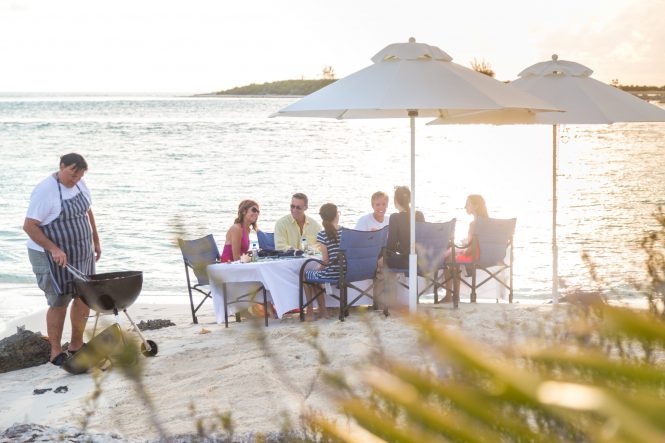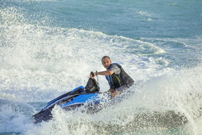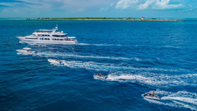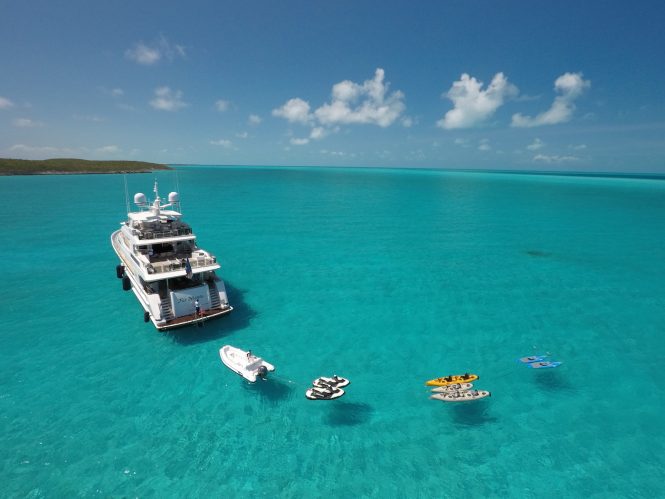 If you’re looking to host a spectacular party in the stunning Caribbean or Bahamas charter grounds, then look no further than M/Y LADY JOY. On board there is a piano and karaoke system for those who love live music, a media room and a skylounge with a wet bar. The abundance of exterior spaces will suit sun-worshippers and nature lovers alike, with a large shaded main deck aft lounge and a gorgeous sundeck with sunbeds along the stern, a wet bar and a Jacuzzi. The large collection of water toys includes Scuba diving equipment so that certified divers can get up close to the wonders just waiting beneath the water.