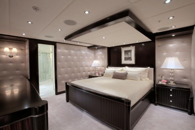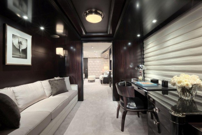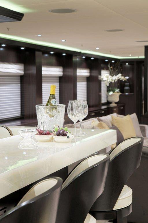 Carol Williamson’s touch is evident throughout the interior, it is rich with the masculinity of hand-wrought hard woods and urbane with the femininity of light soft goods and stylish accents. While yacht Carpe Diem ‘fully incorporates the careful play of architecture, light and complex sophisticated colour’ CW+A is widely recognized for, she also boasts tremendous living space featuring a magnificent main salon, expansive dining salon, main aft deck with wet bar and air conditioning, dual staircase to her extended swim platform and passerelle—which even includes modular furniture—a full-width sky lounge, upper aft deck, Portuguese bridge and sun deck.