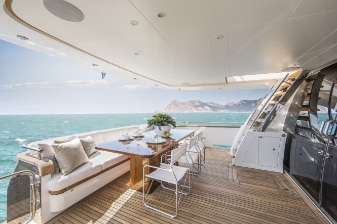 The main deck cockpit is fitted with a sofa and additional chairs surround a raised table for alfresco dining and outdoor living in the shade. A port staircase leads to the flybridge, where the tenders and motorised water toys are stored along the aft and the central section beneath the hardtop contains a C-shaped sofa with tables for alfresco dining and drinks, and forward there are two sunpads either side of the helm station. Additional sunbathing space can be found on the foredeck where sunpads cover the section in front of the raised pilothouse.