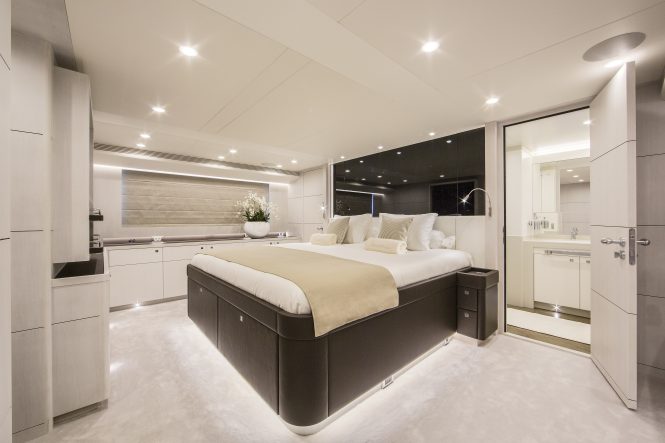 On the lower deck the Master suite takes advantage of the full beam amidships, while the VIP stateroom is placed in the bow and between them a double cabin and bunk cabin for children, all with en-suite facilities.