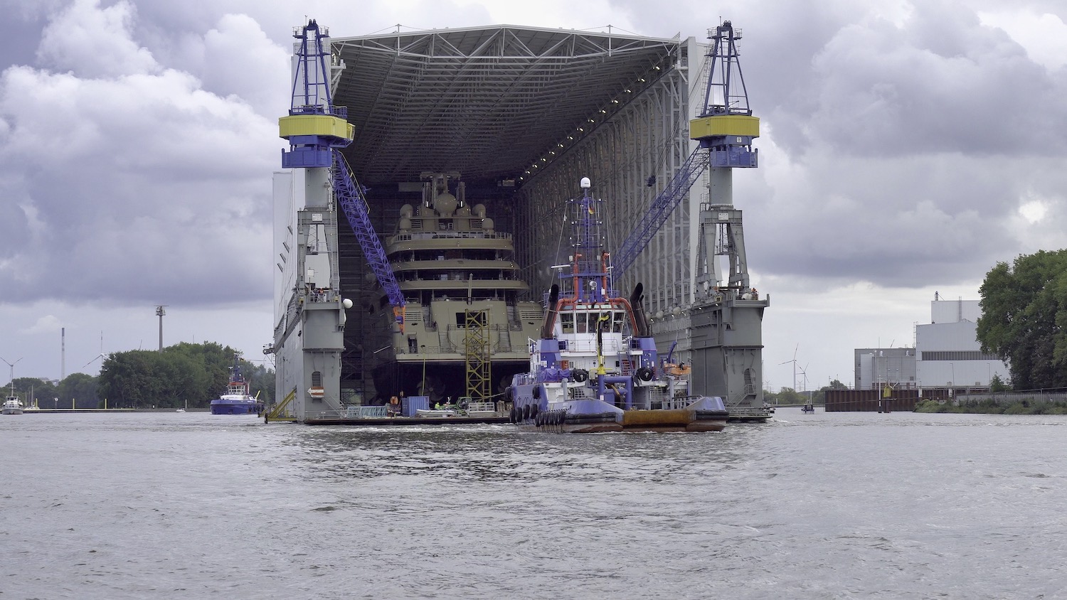 DILBAR inside dock 10 on her way to Lurssen – Photo © DrDuu