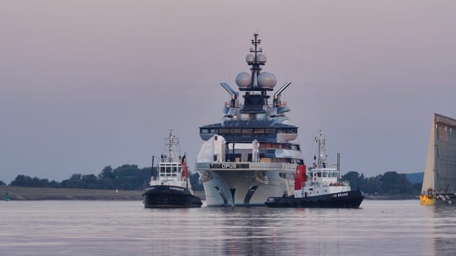 Superyacht photographer ‘Dr. Duu‘ has captured the moment when the 142m/465.9ft mega yacht OPUS (ex.PROJECT REDWOOD) was manoeuvred into her floating dock outside the Lürssen facilities.