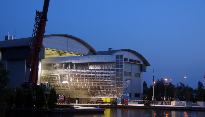 Hull of the 78m superyacht VENUS leaving the shed at the Gouwerok Vries facility