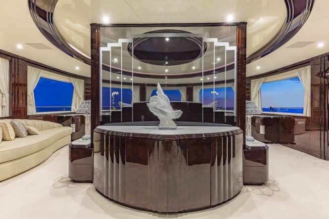 The sundeck is a hub for outdoor socialising, and along the stern there is a swimming pool surrounded by large sunbeds and forward the wet bar will serve guests soaking in the water or socialising at the aft alfresco lounge.