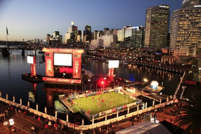 Australia’s first floating football pitch is hosting street soccer competitions between local teams from the emergency services and other local groups as part of the program of celebrations for the World Cup. To find out more, go to www.sydneyfifafanfest.com.au/. Once the World Cup is finished the floating football field will be dismantled and then reassembled to form the walkways for the Sydney International Boat Show – Australia’s biggest Boat Show, being held from 29 July to 2 August. Programmes are tight, but all involved are confident in transforming Darling Harbour from football mania to boating heaven in as little as two weeks.