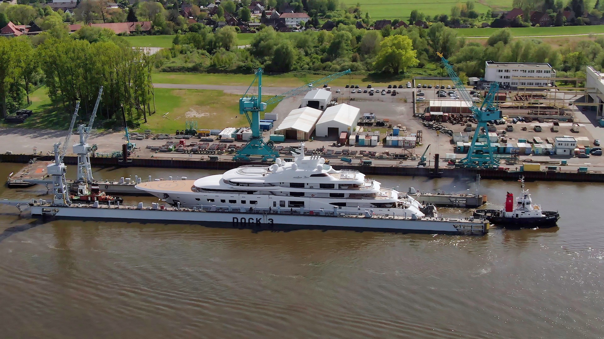 This image is featured as part of the article Watch: 104m Mega Yacht Quantum Blue leaves Lurssen shipyard.