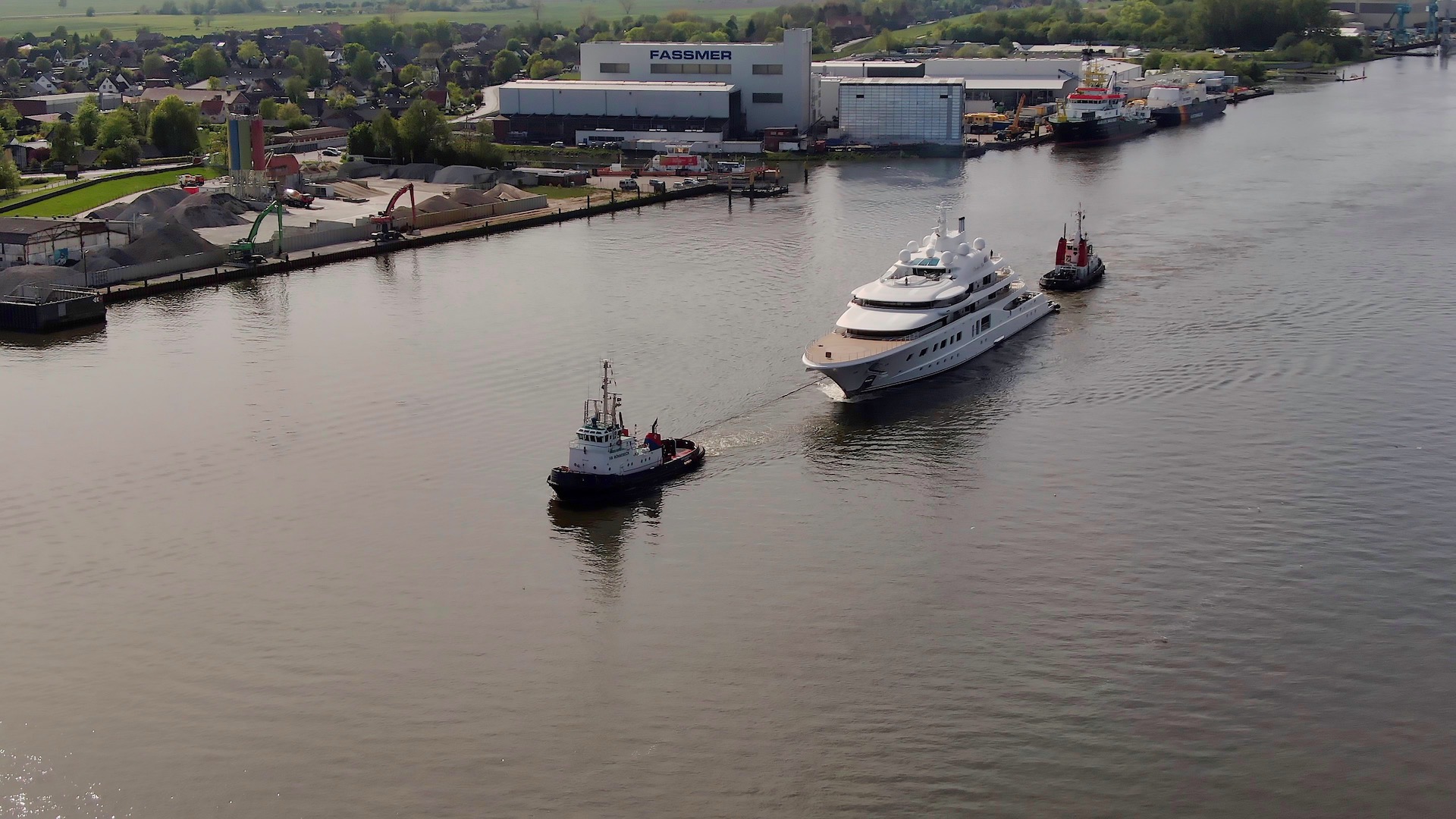 This image is featured as part of the article Watch: 104m Mega Yacht Quantum Blue leaves Lurssen shipyard.